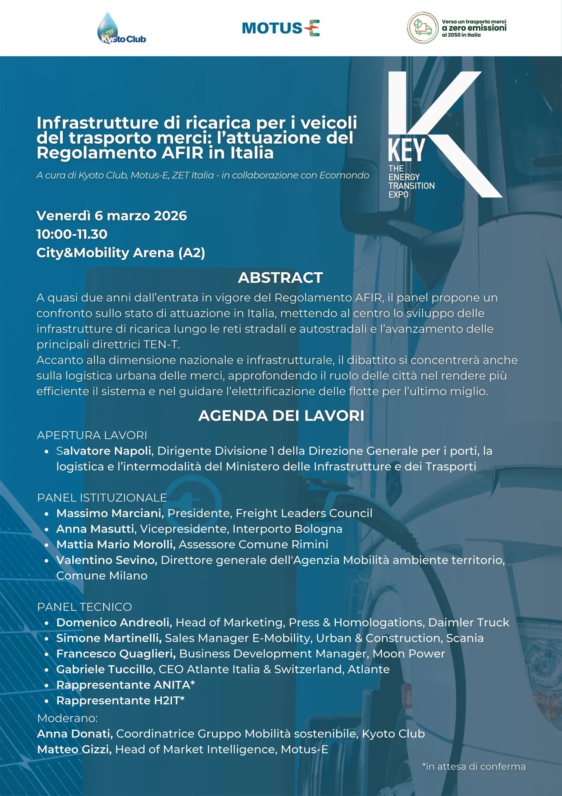 L’evento si tiene a Rimini Fiera al Key, The Energy Transition EXPO, venerdì 6 marzo 2026, dalle 10:00 alle 11:30, presso la City & Mobility Arena (Pad. A2) . L’incontro fa il punto sull’attuazione del Regolamento AFIR in Italia, con particolare attenzione allo sviluppo delle infrastrutture di ricarica per il trasporto merci pesante lungo le principali direttrici stradali.
