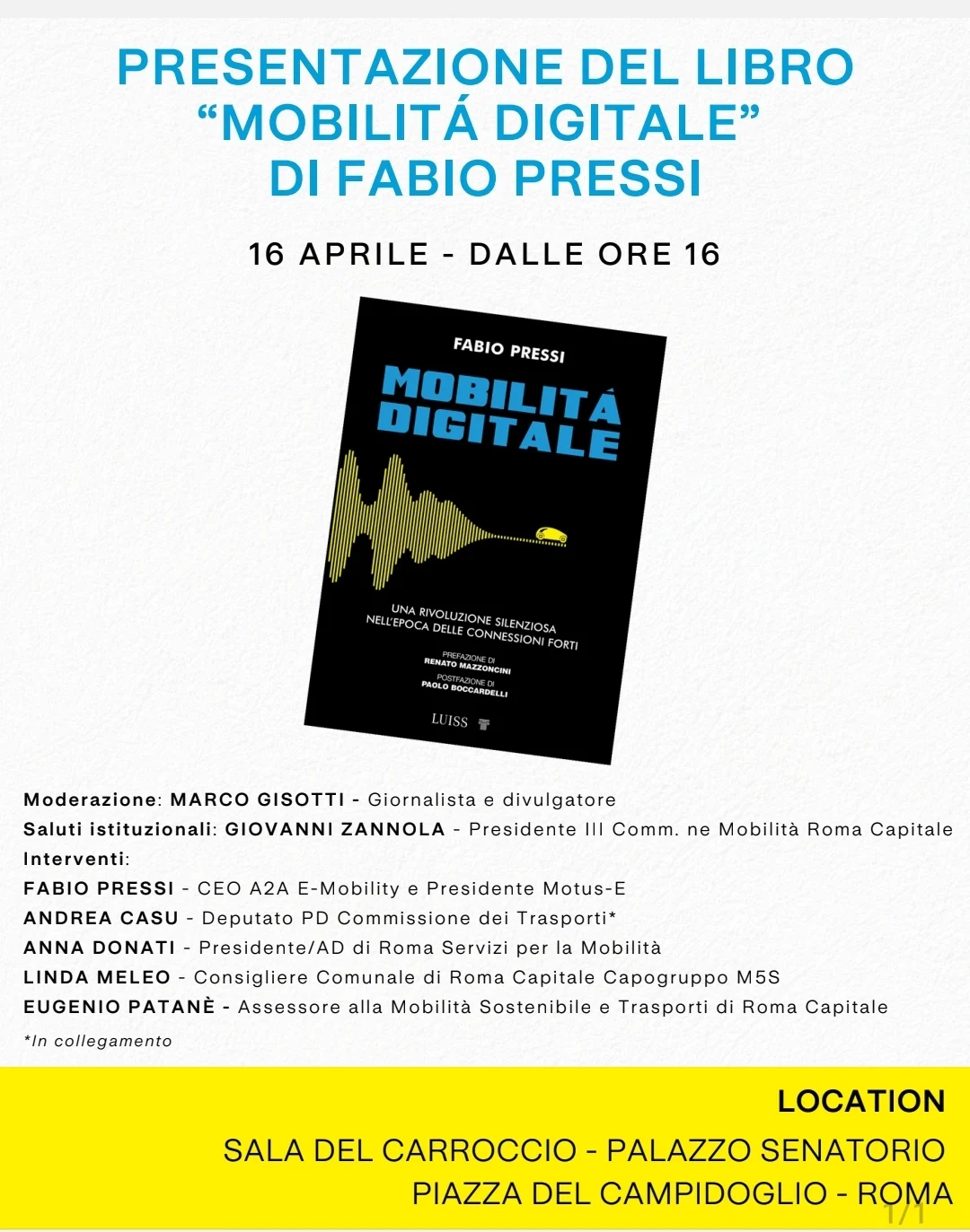 Il 16 aprile, dalle ore 16:00 a Roma presso la Sala del Carroccio – Palazzo Senatorio in Piazza del Campidoglio verrà presentato il libro di Fabio Pressi “Mobilità Digitale. Una rivoluzione silenziosa nell’epoca delle connessioni forti” con la prefazione di Renato Mazzoncini e la postfazione di Paolo Boccardelli.