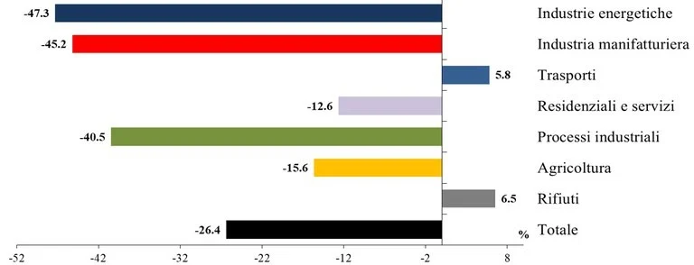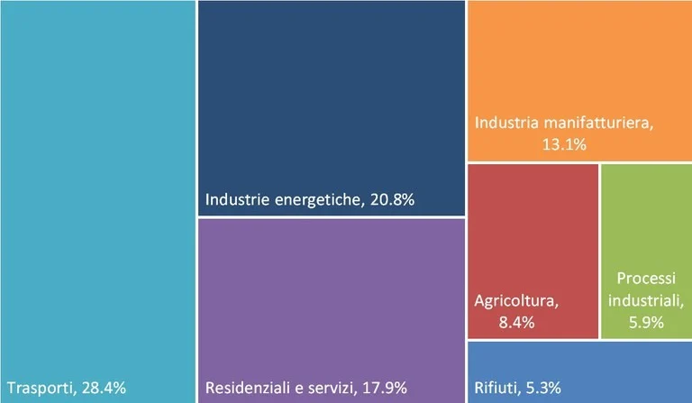 Oltre ai trasporti (28% del totale nazionale), i settori della produzione di energia (21%), residenziale (18%) e dell’industria manifatturiera (13%) sono, nel periodo di riferimento, quelli che contribuiscono ad oltre la metà delle emissioni nazionali di gas climalteranti.