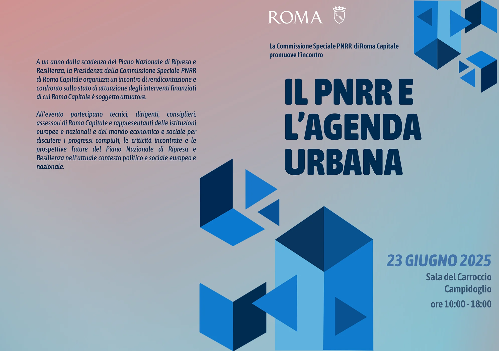 Evento ideato dal Presidente della Commissione Speciale PNRR di Roma Capitale, Cons. Giovanni Caudo, dal titolo “Il PNRR e l’Agenda Urbana”, promosso dalla Presidenza della Commissione Speciale PNRR, che si terrà il prossimo 23 giugno 2025 presso la Sala del Carroccio in Campidoglio a Roma, dalle ore 10,00 alle ore 18,00.