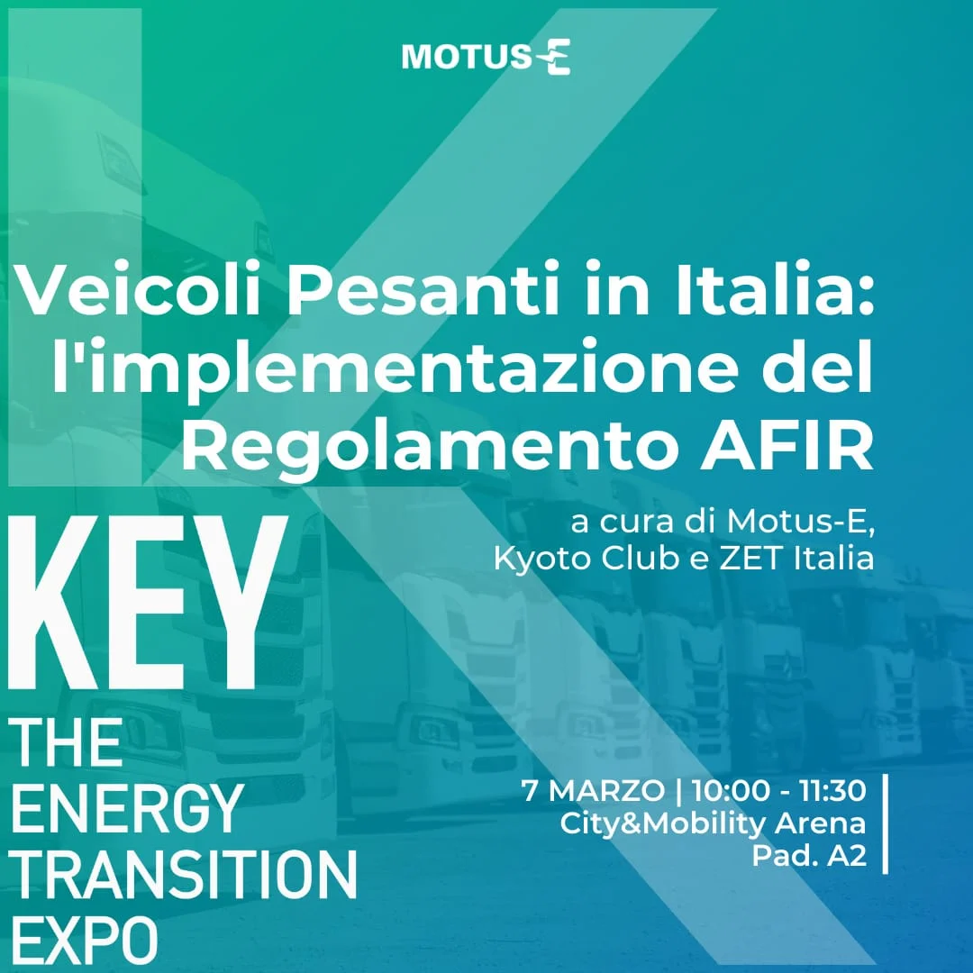 Si tiene il 7 marzo 2025 alle ore 10-11,30 – a Key Energy Fiera di Rimini – l’evento promosso da MOTUS-E, Kyoto Club e ZET Italia sulla attuazione in Italia della rete per le infrastrutture di ricarica per i veicoli del trasporto merci pesante. ll Regolamento AFIR approvato dall’Unione Europea la copertura di stazioni di ricarica su tutte le principali arterie stradali europee, migliorando l’accessibilità e l’efficienza per camion e autobus elettrici. In Italia, l’implementazione del Regolamento AFIR richiede la pianificazione e lo sviluppo di un’infrastruttura nazionale di ricarica ad alta potenza lungo le principali rotte del TEN-T.